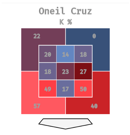 Oneil Cruz is widely regarded as one of baseball’s best power hitters after bursting onto the scene as a top prospect with the Pittsburgh Pirates. Though, throughout his time in minors, Oneil has had a glaring issue with his strikeout numbers. Since 2019, Cruz has maintained a K% of 22.7% or higher 6 times, in either a new level or returning to a level from the previous year. Cruz’s highest K% since 2019 was 34.9% excluding his 2 game stint in the MLB in 2021. What is causing this? Can it be fixed? We will be taking a look at one of the possible theories below.