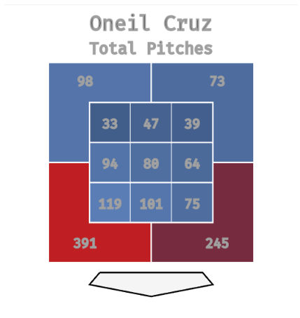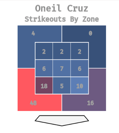 Some other data that supports this theory are some of Oneil’s zone graphs. The graphs below all represent where Cruz gets pitched the most and where he strikes out the most. These numbers present that potentially opposing pitchers have caught on to the fact that Cruz gets a lot of called strikes and strikeouts in the bottom of the zone. The increase in pitches in the bottom of the zone is just more proof of the Aaron Judge bug being caught by Cruz.