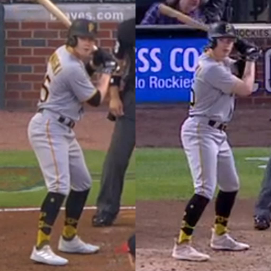 With improvements to his chase rate, and other metrics as previously mentioned, it’s safe to say Suwinski’s eye is improving at the plate. Something else I’ve notified when it comes to Suwinski’s game? A slight stance adjustment. Suwinski seems to be less compact, and more comfortable at the plate, all factors that could lead to the more consistent barrel rates, and decreases in chase rate like we’ve seen. With Suwinski’s swing path also looking better this season, it’s safe to say this may be a contributing factor to the success he’s been having.